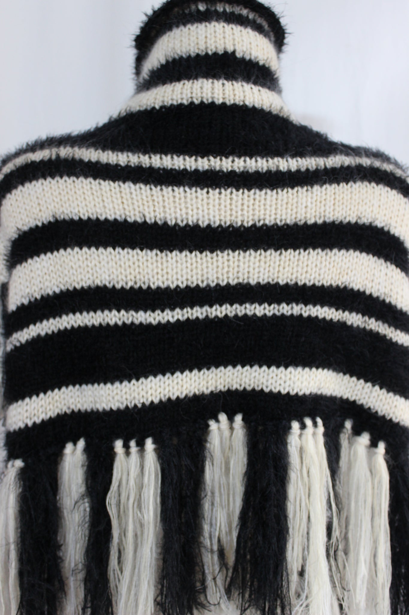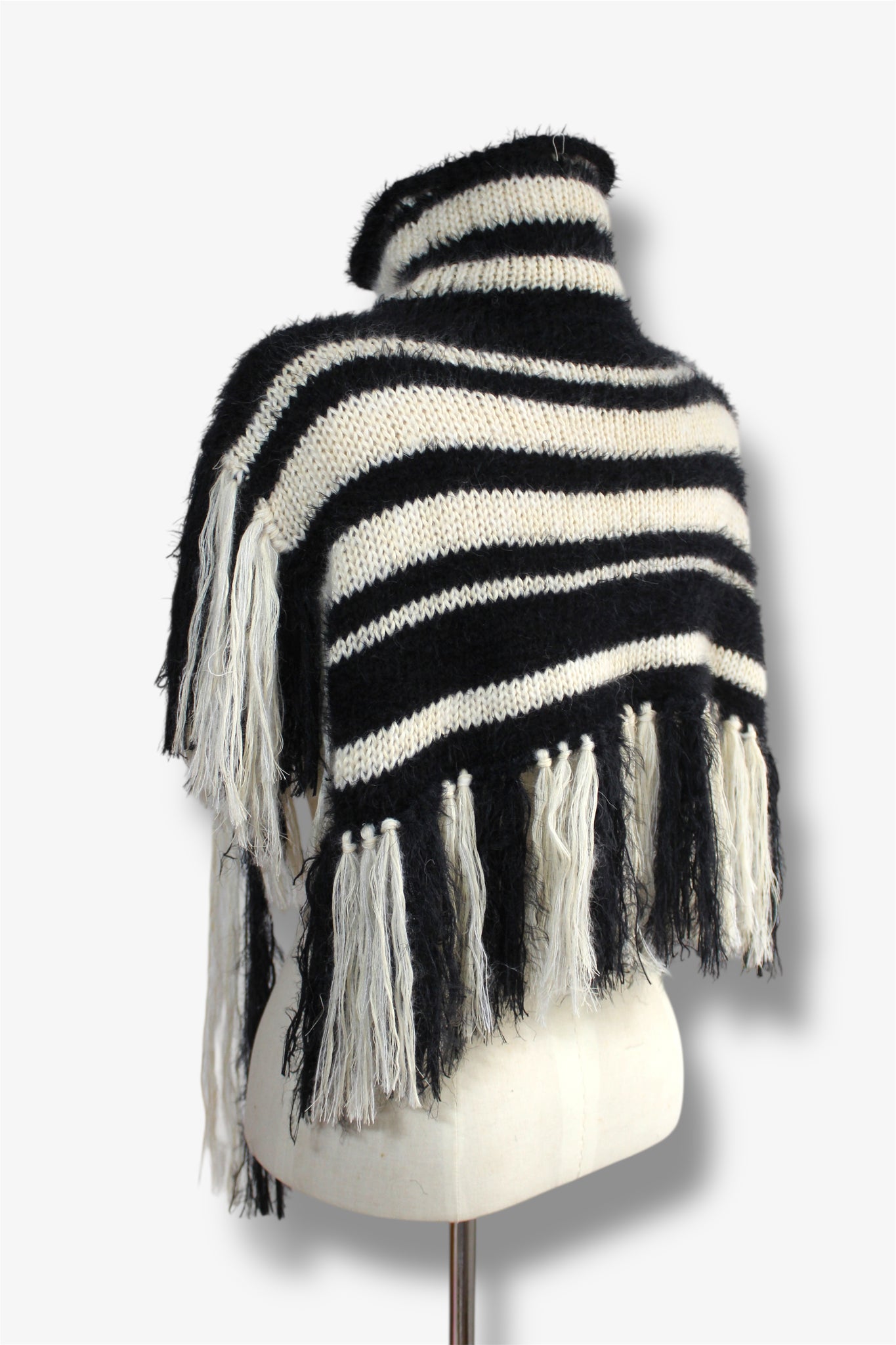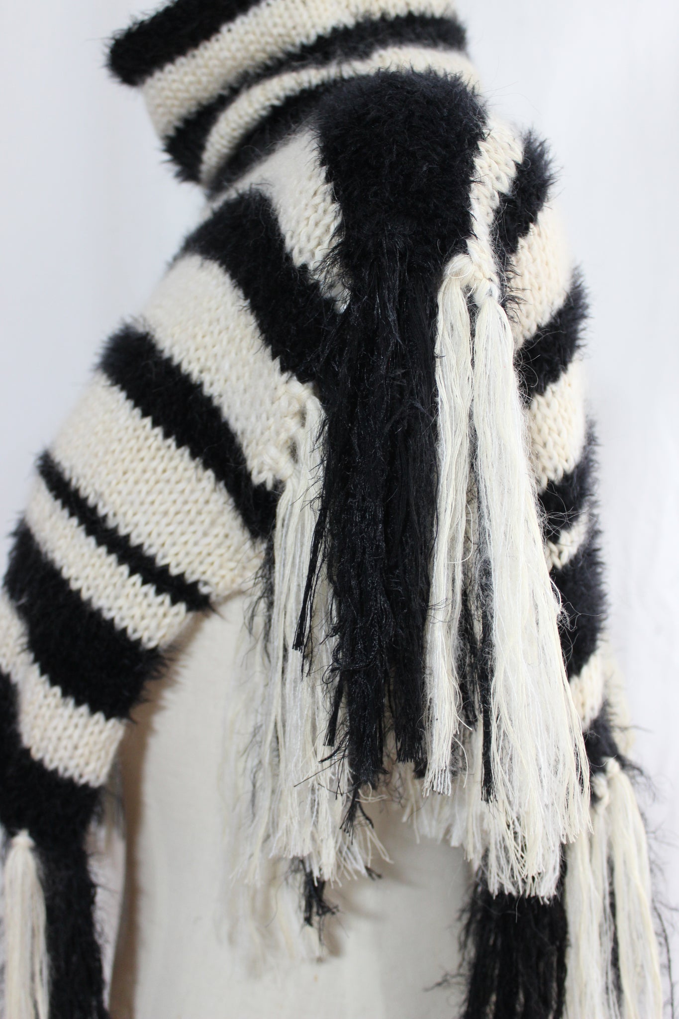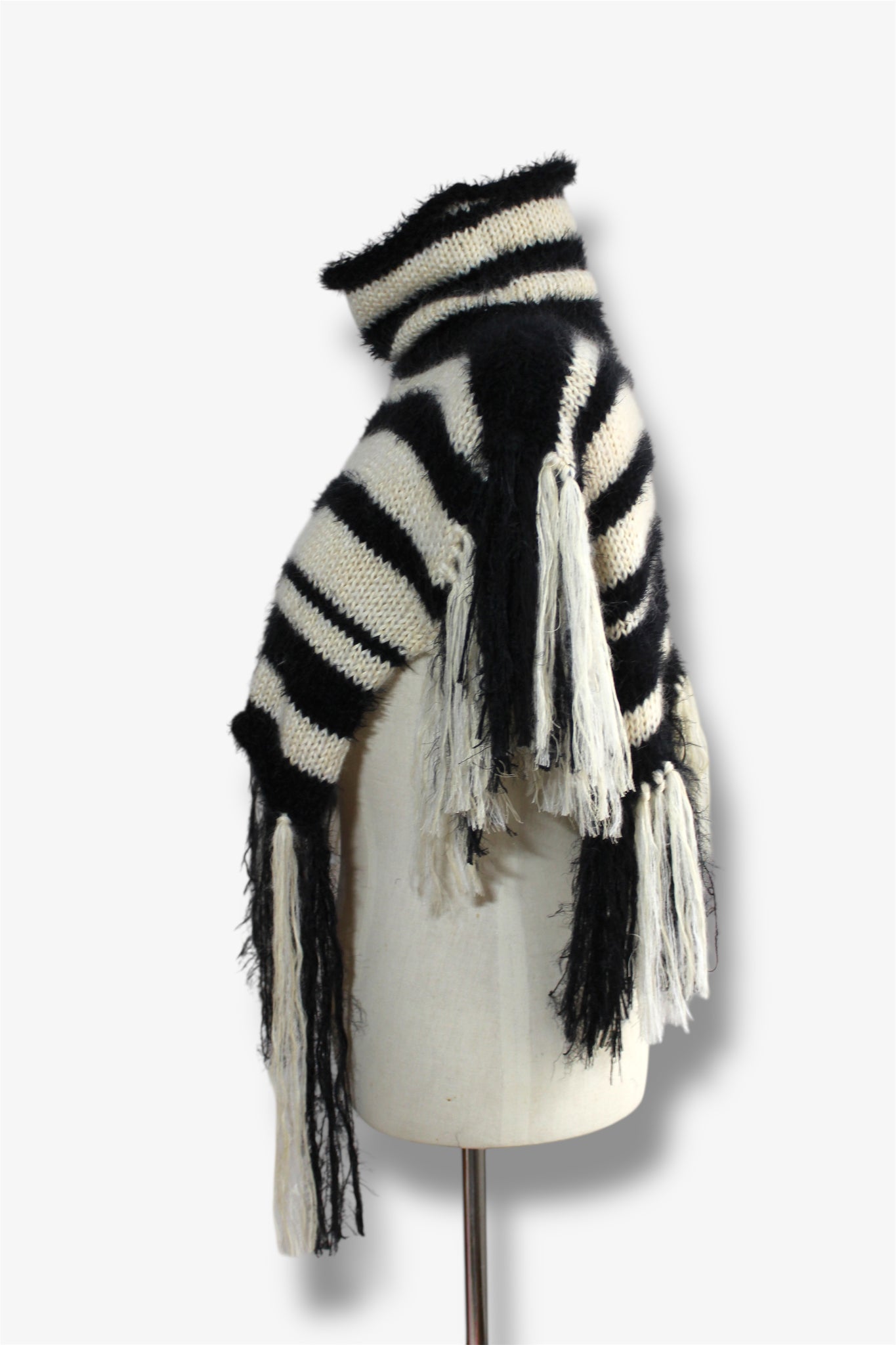 With its bold, colorful stripes and long, hand-knotted fringes, this accessory adds a playful touch and beautiful movement to your look. Whether layered over a dress or a turtleneck sweater, it’s a versatile styling piece that keeps you warm while making a fashion statement.