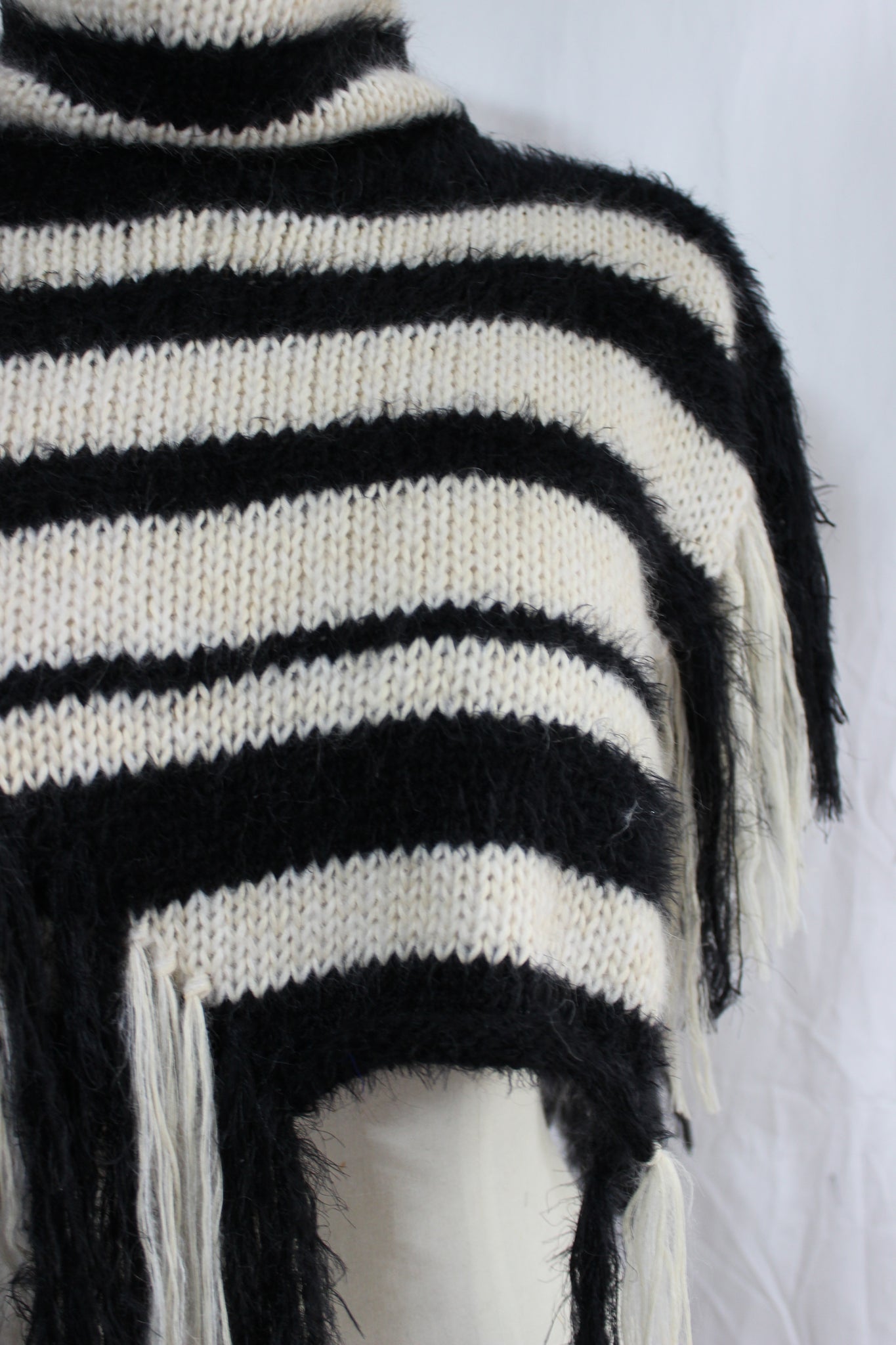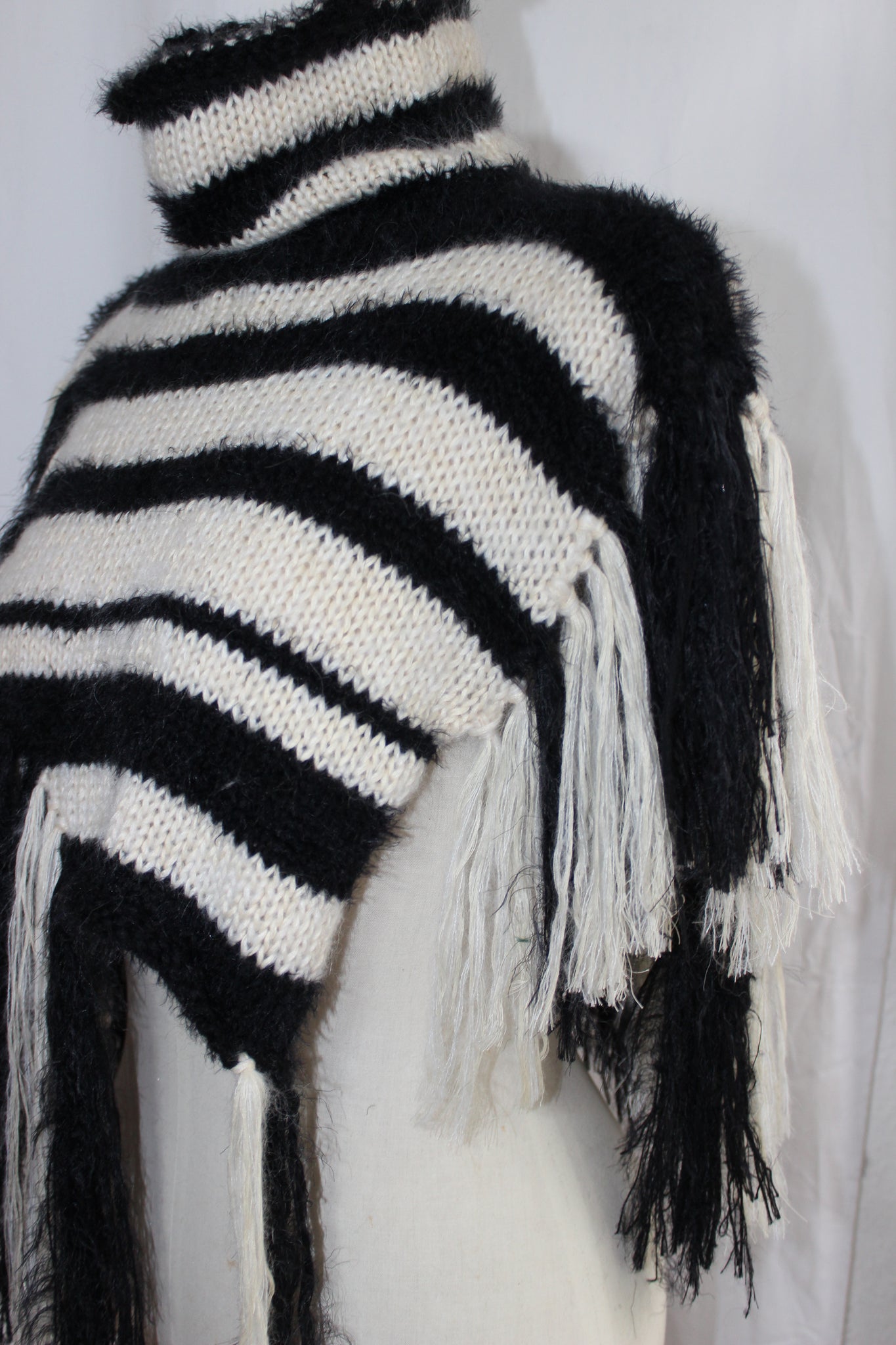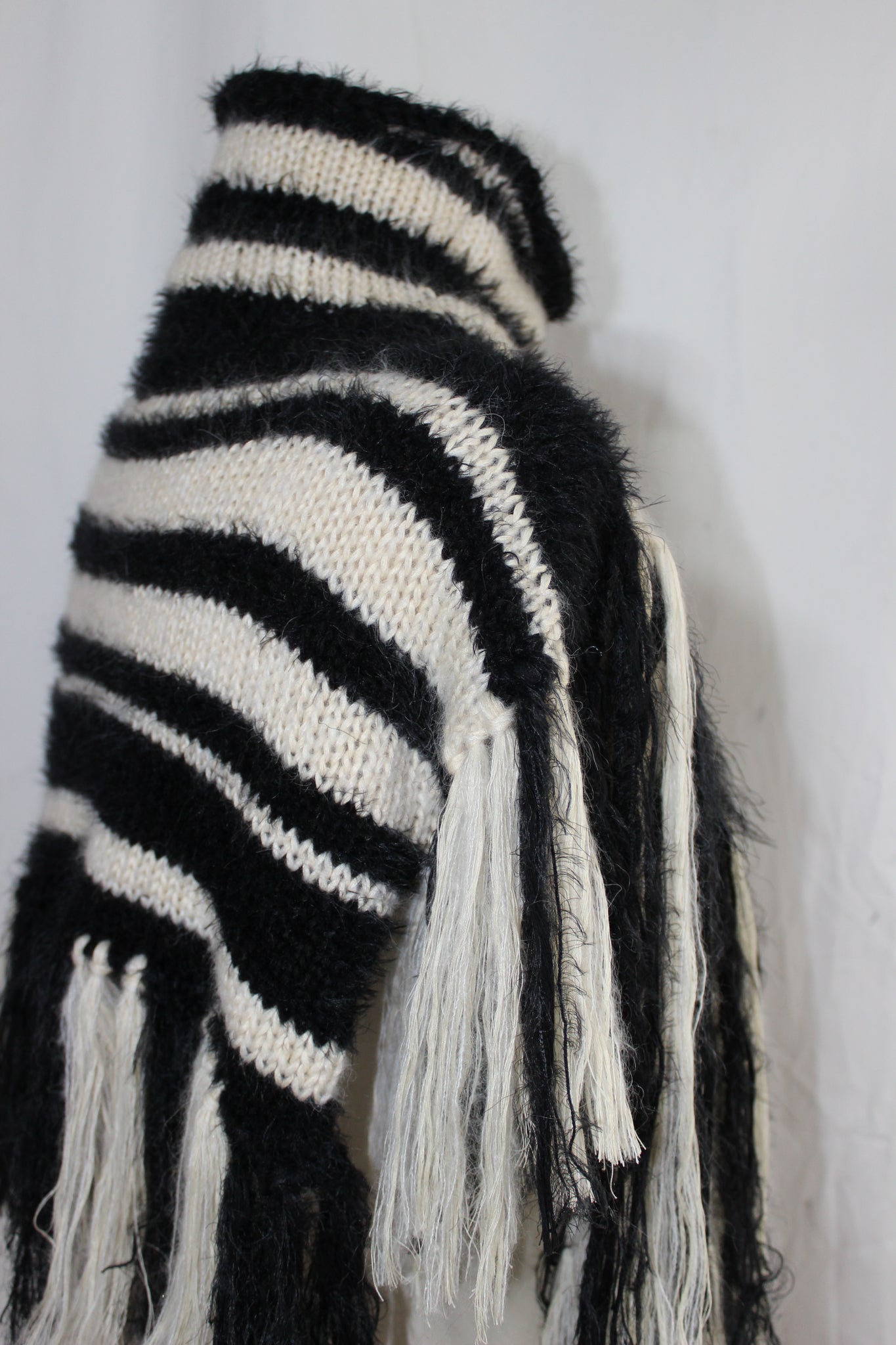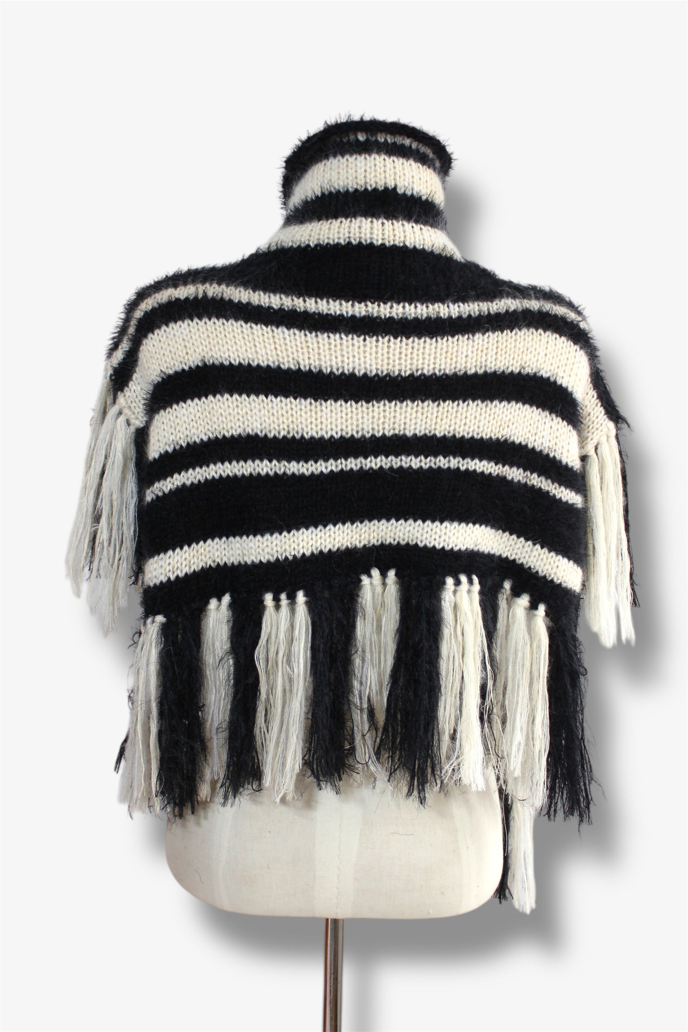With its bold, colorful stripes and long, hand-knotted fringes, this accessory adds a playful touch and beautiful movement to your look. Whether layered over a dress or a turtleneck sweater, it’s a versatile styling piece that keeps you warm while making a fashion statement.