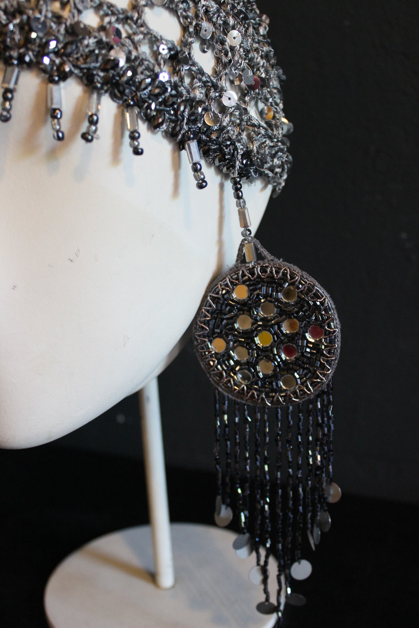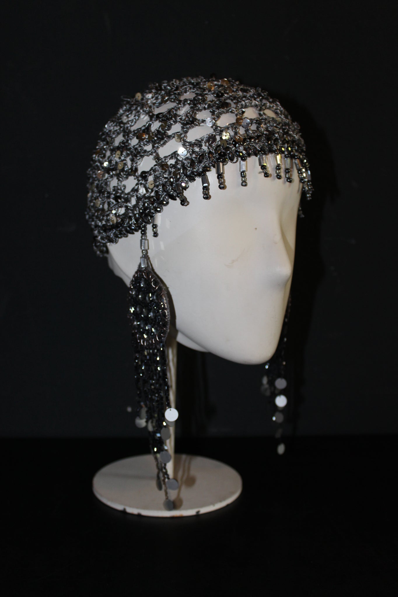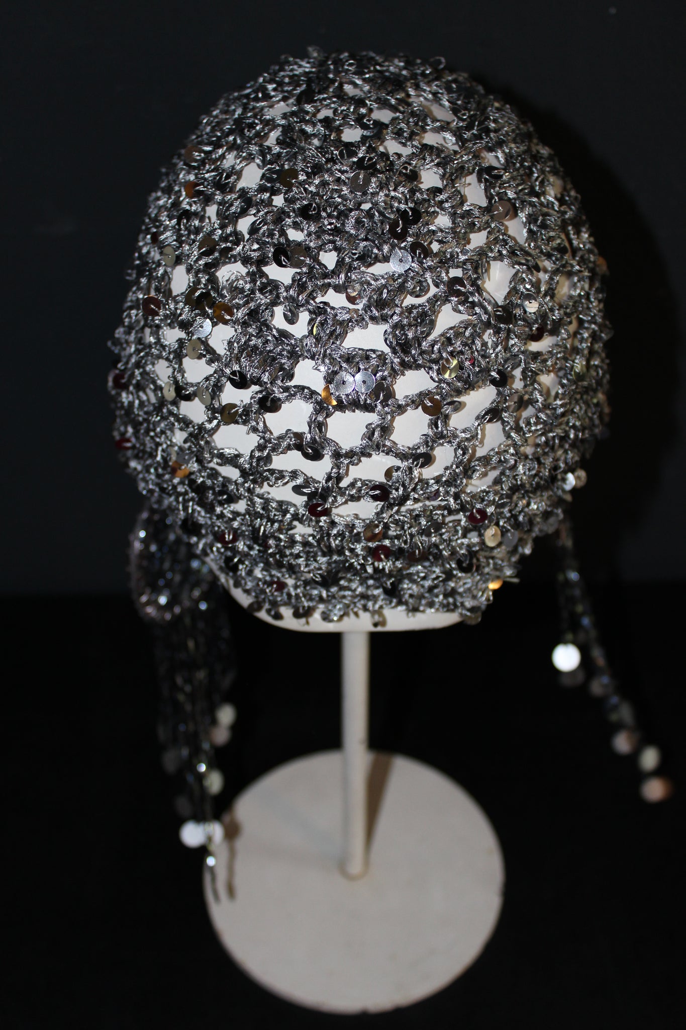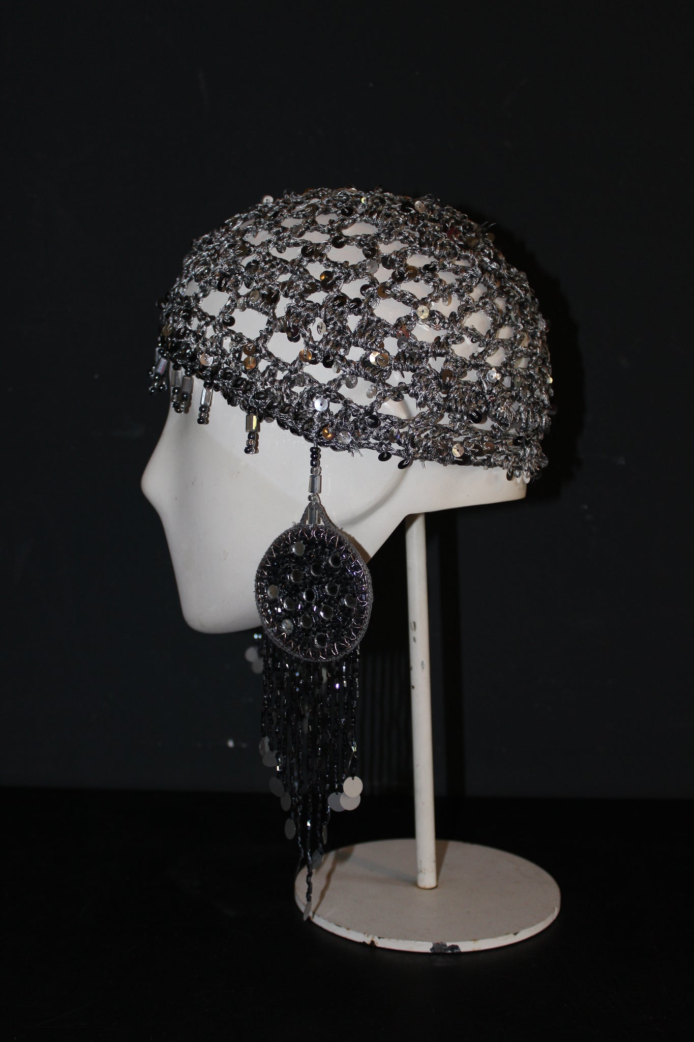 The shimmering silver sequin yarn adds a touch of glamour, while the cascading beaded chains create movement and light reflection. Whether worn as a fashion-forward accessory, performance piece, or artistic statement, this headpiece is both versatile and eye-catching.